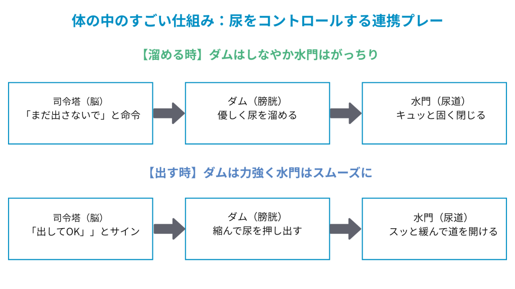 - 溜めるとき:交感神経が働き、ダム(膀胱)をリラックスさせて広げ、水門(尿道)はキュッと固く閉じます